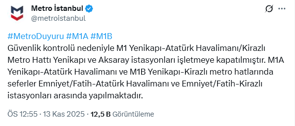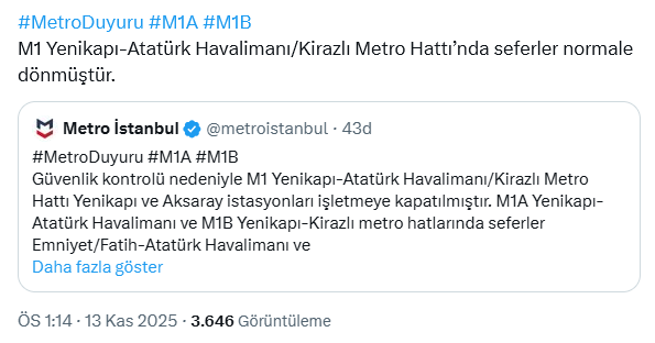 “12.55: Güvenlik kontrolü nedeniyle M1 Yenikapı-Atatürk Havalimanı/Kirazlı Metro Hattı Yenikapı ve Aksaray istasyonları işletmeye kapatılmıştır. M1A Yenikapı-Atatürk Havalimanı ve M1B Yenikapı-Kirazlı metro hatlarında seferler Emniyet/Fatih-Atatürk Havalimanı ve Emniyet/Fatih-Kirazlı istasyonları arasında yapılmaktadır.