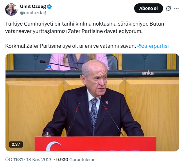 Hemen ardından açıklamanın yer aldığı videoyu paylaşan Zafer Partisi lideri Ümit Özdağ ise, “Türkiye Cumhuriyeti bir tarihi kırılma noktasına sürükleniyor” ifadelerini kullanırken şunları kaydetti: